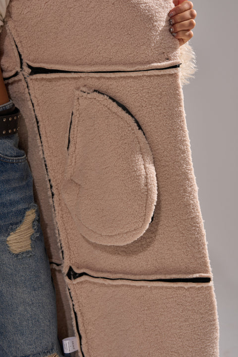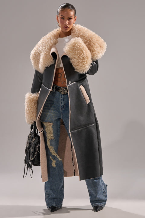 Yeah, baby, she’s got it! The She Got It Fluffy Sherpa Faux Leather Trench Coat is made from a non-stretch faux leather fabrication and features a wide, fluffy bonded faux sherpa collar, long sleeves with coordinating faux sherpa cuffs, slant side pockets with faux sherpa trim, faux sherpa lining, a longline silhouette, and snap button front closures.